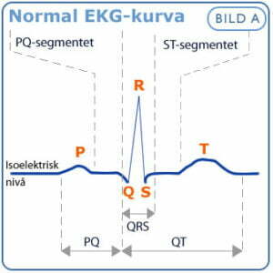 EKG – elektrokardiografi – är en registrering av den elektriska aktiviteten som alstras och överförs av speciella hjärtceller. Kroppens vävnad är ledande, och de elektriska hjärtsignalerna kan avledas från kroppsytan. EKG är den diagnostiska metod som används mest vid förmodad hjärtsjukdom. Elektrokardiodiagrammets olika delar för varje hjärtslag beskrivs genom en vedertagen bokstavskombination.