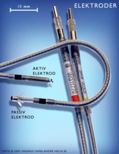 I pacemakersammanhang talar man om pacemakerelektroder – tunna, sterila, elektriska sladdar som kopplas till pacemakern och går till hjärtat via vensystemet.